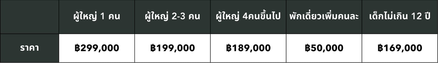 *ราคาข้างต้นไม่รวม : ตั๋วเครื่องบินเดินทางไปกลับ / ค่าทิปไกด์และพนักงาน / ค่าอาหารและเครื่องดื่มนอกเหนือที่จัดเตรียมให้ / ค่าซักเสื้อผ้า / ค่าใช้จ่ายส่วนตัวอื่นๆ