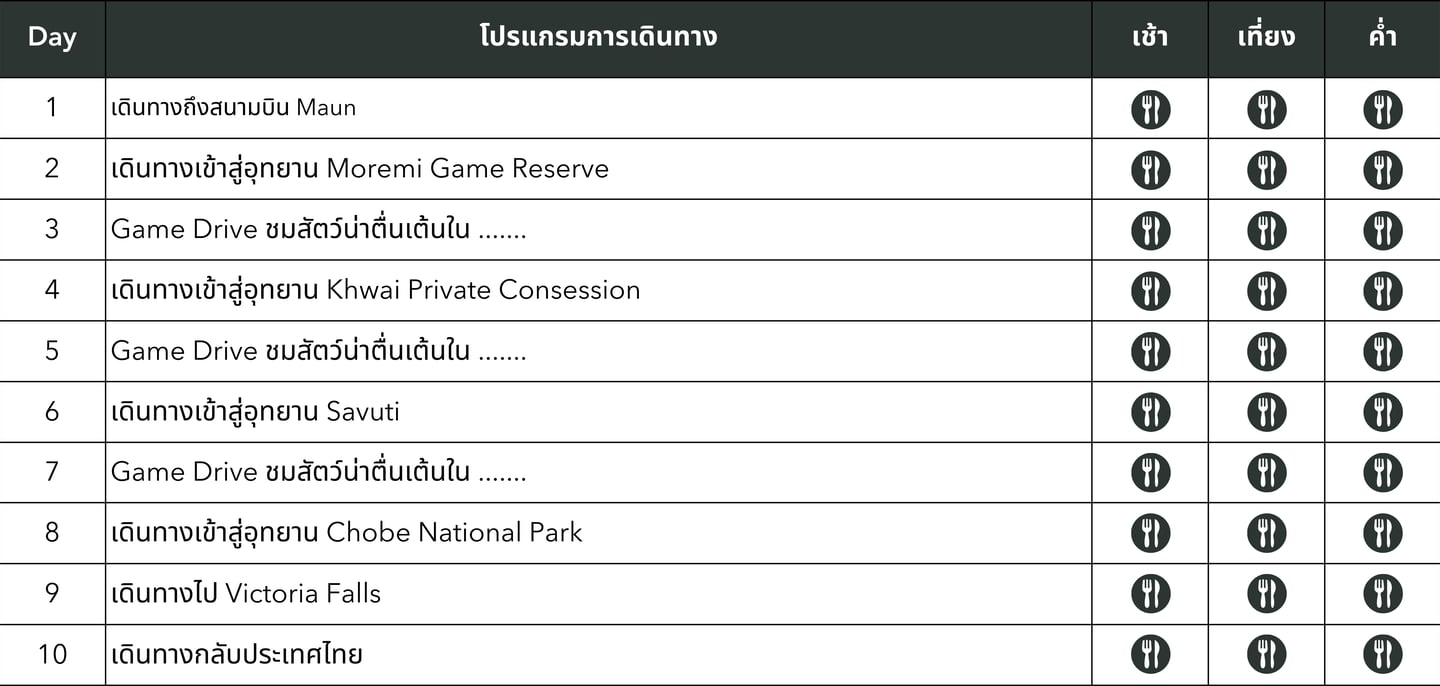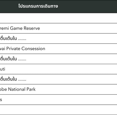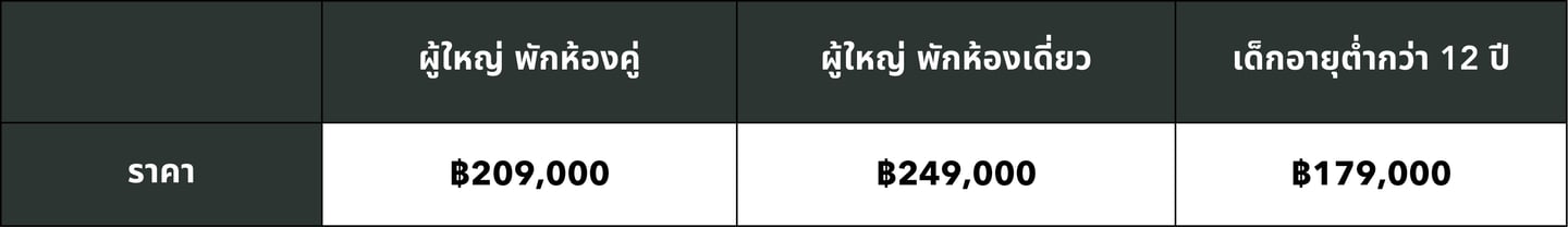*ราคาข้างต้นไม่รวม : ตั๋วเครื่องบินเดินทางไปกลับ / ค่าทิปไกด์และพนักงาน / ค่าอาหารและเครื่องดื่มนอกเหนือที่จัดเตรียมให้ / ค่าซักเสื้อผ้า / ค่าใช้จ่ายส่วนตัวอื่นๆ